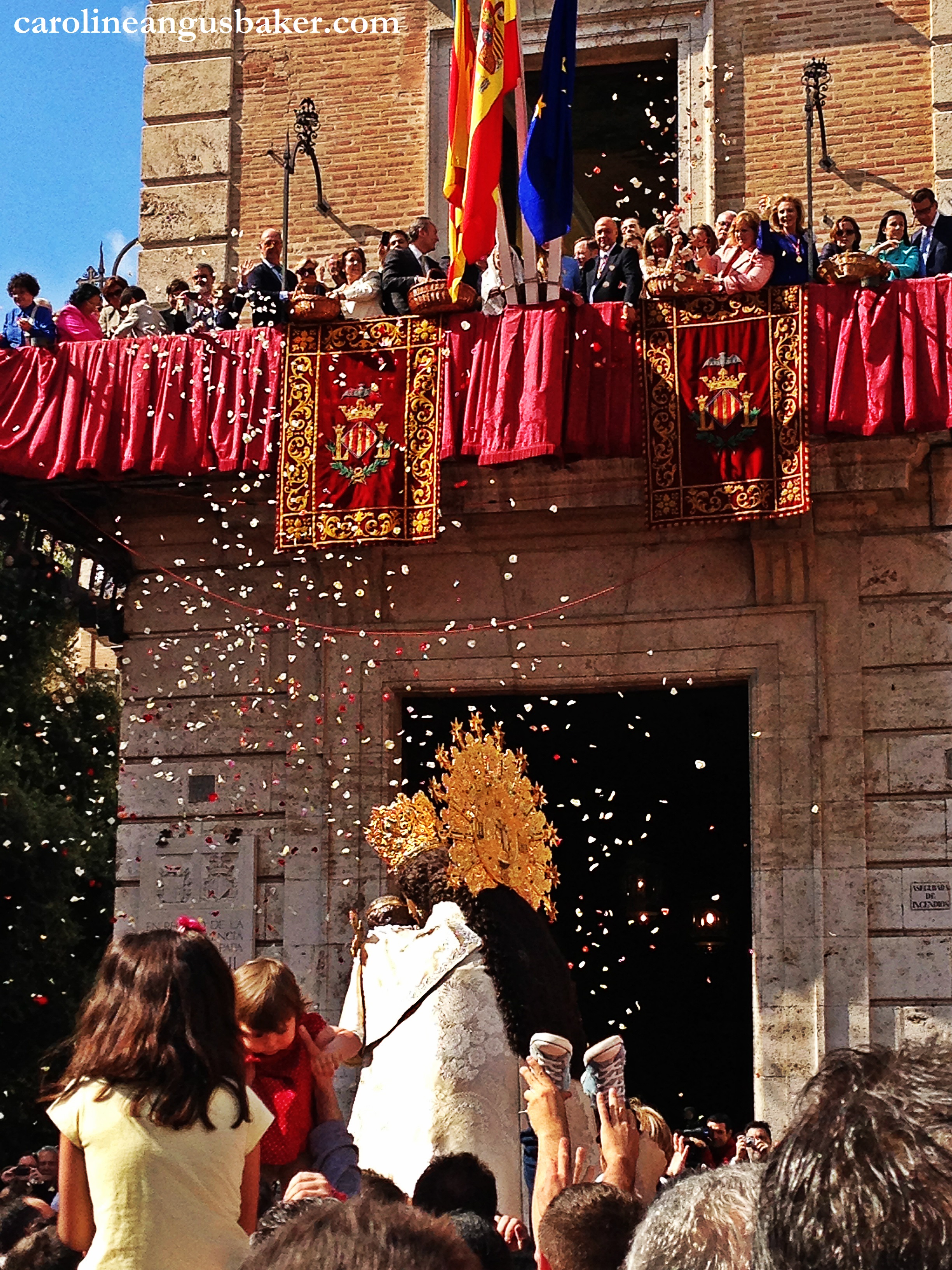 Valencia’s ghastly mayor, Rita Barberá, throws petals at the Virgen while people toss forth their kids. It’s all smiles on the balcony for the rich, not so much for people on the ground