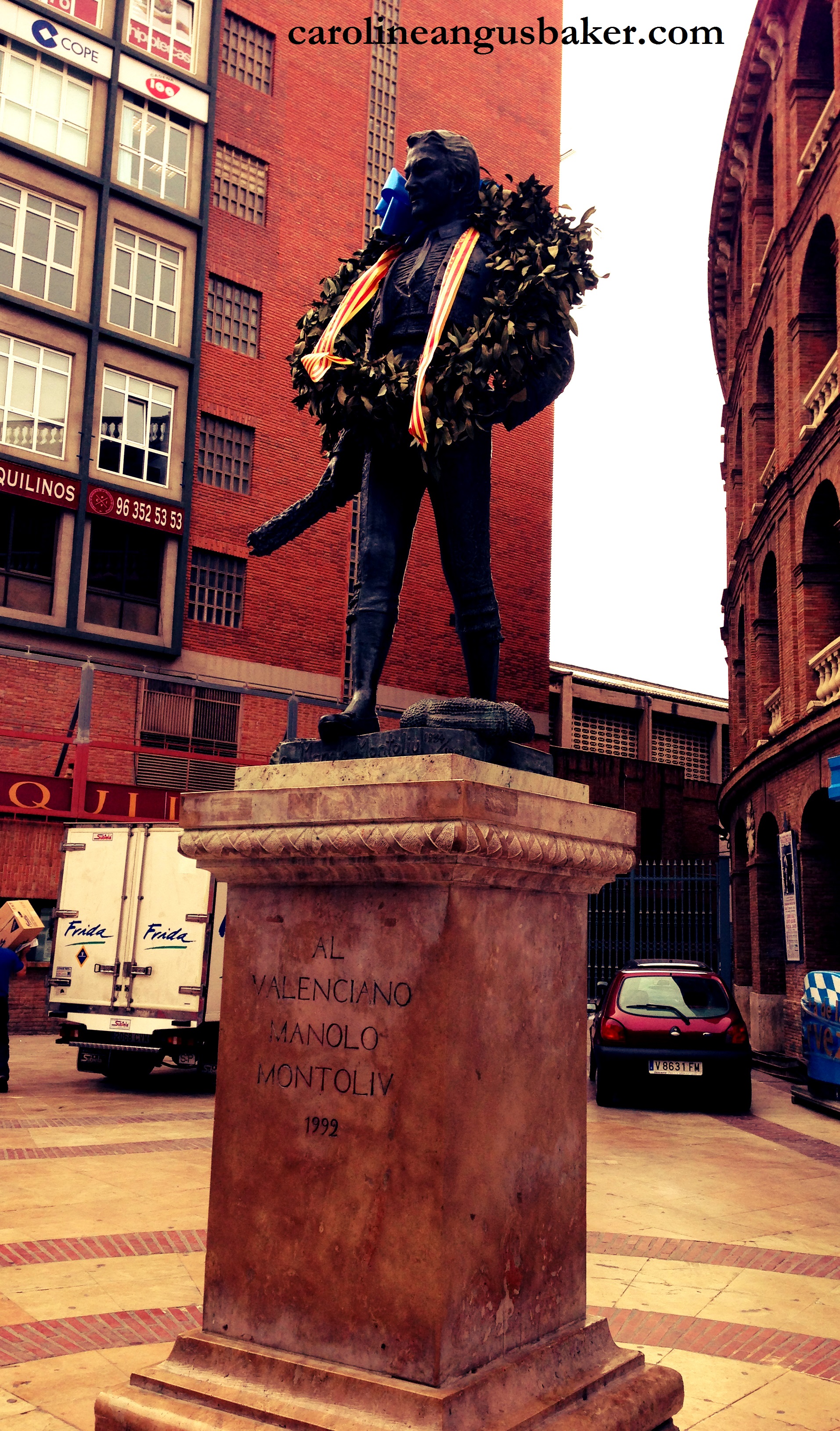 I pass by the bullring, Plaza de Toros de Valencia, which is closed this early, even the ticket booths. Posters are up for the upcoming weekend fight. I must go (it will later disappoint me). The statue of Valencian fighter Manolo Montoliu has had an artificial wreath put around his neck, and it’s covered in ribbons the colour of the Valencian flag. The anniversary of his death has just passed.