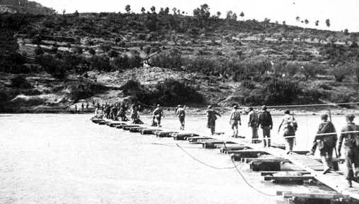 The early hours of July 25 are completely dark with no moon. Between Fayon and Benifallet, a 45 kilometre bend in the river, the commanders again cross the river and kill 50th Division Nationalist guards posted in the area. After fastening assault boats, the first of 90 boats cross, ten men in each boat, under darkness. All following troops then cross on pontoon bridges at daybreak. The Nationalists are totally unprepared for this wide attack, overcome in surprise. The International Brigade attack 40 kilometres south of Benifallet at Amposta, but are overpowered within the first 18 hours of combat, with the few survivors retreating back over the Ebro.