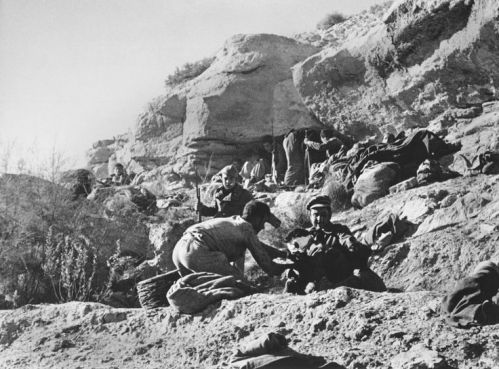 The town of Gandesa is a key target for the Republicans, which is 25 kilometres west of their first river crossing point. Gandesa is surrounded by hilly limestone terrain in the Caballs, Pandols and Fatarella ranges. The limestone hills have little shelter, leaving the men at the mercy of overhead bombers. But they push on, spread out over a 35 kilometre line, eager to take Gandesa, a pivotal town into Catalonia, so men and tanks are forced over the limestone hillsides.