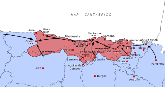 Bilbao is now fully in the hands of the Nationalists and hundreds of thousands have fled either over the border into France or west towards Santander and the Galician coast. The total toll of the Bilbao battle is not established, but the defeated Republican/Basque fighters had started with 50,000 troops, the winning Nationalists with 75,000 (including 15,000 Italians, which only around 105 killed). Nationalists give out food to some of the remaining women in the Basque region, those who were unable to flee the city. The strategic production factories of the Basque country are now in Nationalist hands.